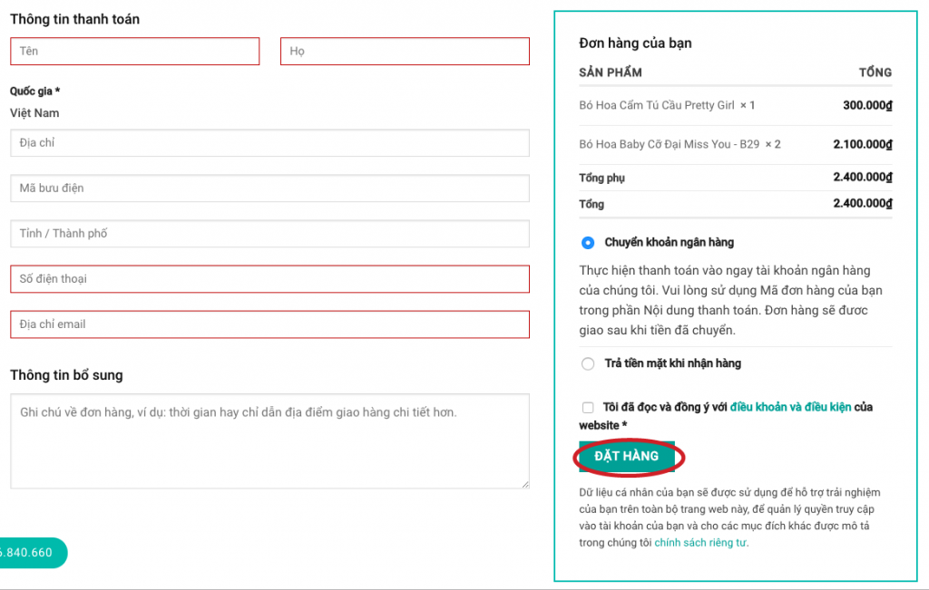 Bước 3: Điền đầy đủ các thông tin yêu cầu và chọn Đặt hàng